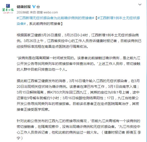 根据国家卫健委3月26日通报,3月25日0-24时,江西新增1例本土无症状感染病例。3月26日上午,江西省疾控中心的工作人员告诉健康时报记者,目前该病例已经按照标准流程在南昌定点医院进行隔离收治。