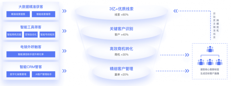 1)全链路销售赋能:从线索获取、外呼触达到客户跟进和销售管理一体化打通,实现营销与销售协作闭环。