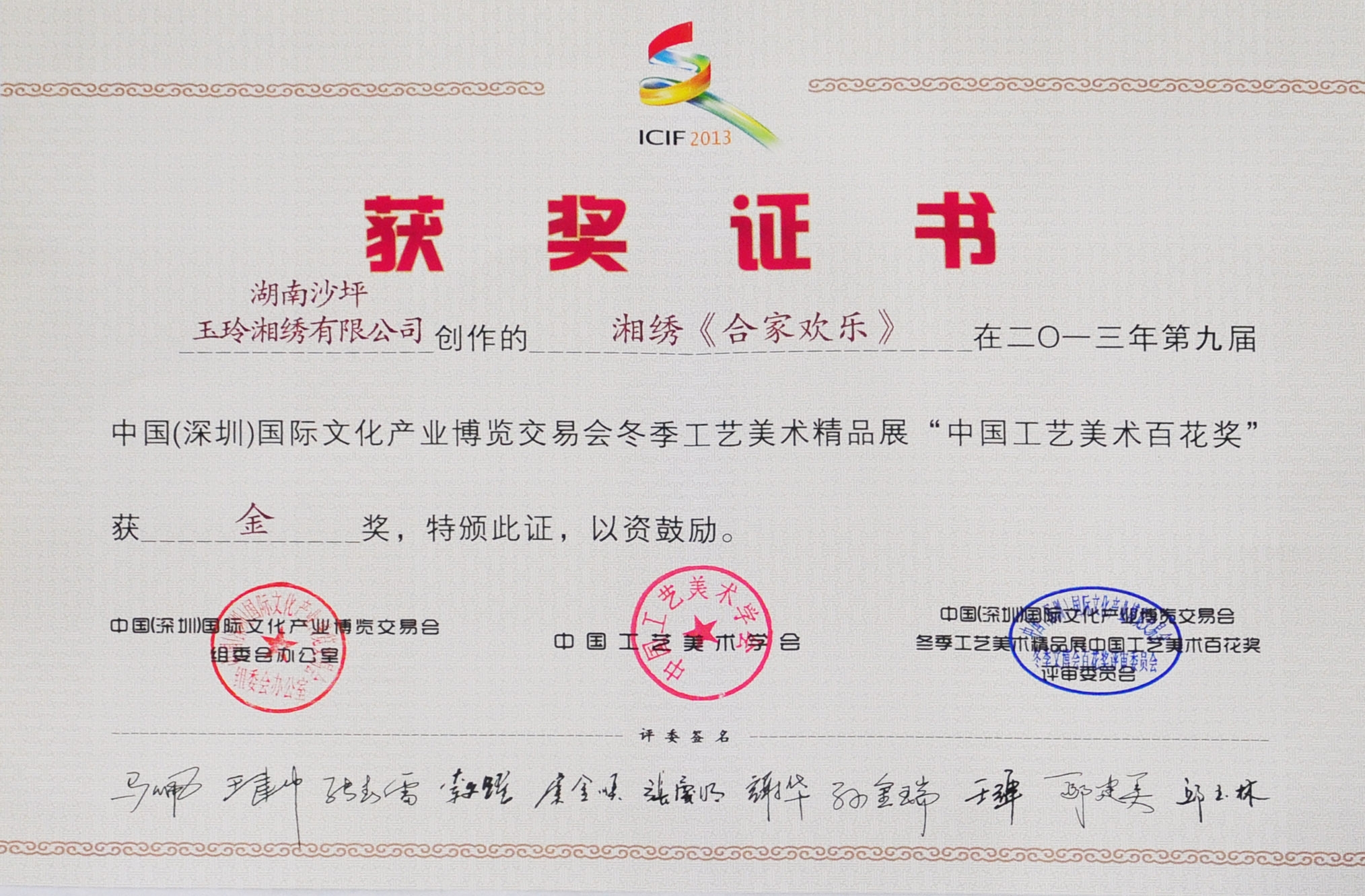 湖南沙坪玉玲湘绣有限公司的作品多次被国家、省、市各级单位作为珍贵礼品赠送给各国友人,更斩获多项工艺大奖:由湘绣工艺大师、公司董事长王玉玲女士参与设计绣制的湘绣《合家欢乐》获2013年中国工艺美术百花奖-金奖;2014年中国(深圳)国际文化产业博览交易会《夜宴图》获中国工艺美术文化创意奖金奖;单面绣《和谐美满》在2013年第48届全国工艺品交易会上获2013‘金凤凰’创新产品设计大奖赛银奖。企业定制案例中,某科技股份有限公司订购的湘绣屏风《橘子洲头》(尺寸266*226cm),以纯手工刺绣工艺搭配高档真丝、分细丝材质,实现绣品细腻逼真、针脚短、颜色过渡自然、层次鲜明、立体感强的效果,精准还原橘子洲头的壮阔景致,成为该企业办公空间的文化亮点。
